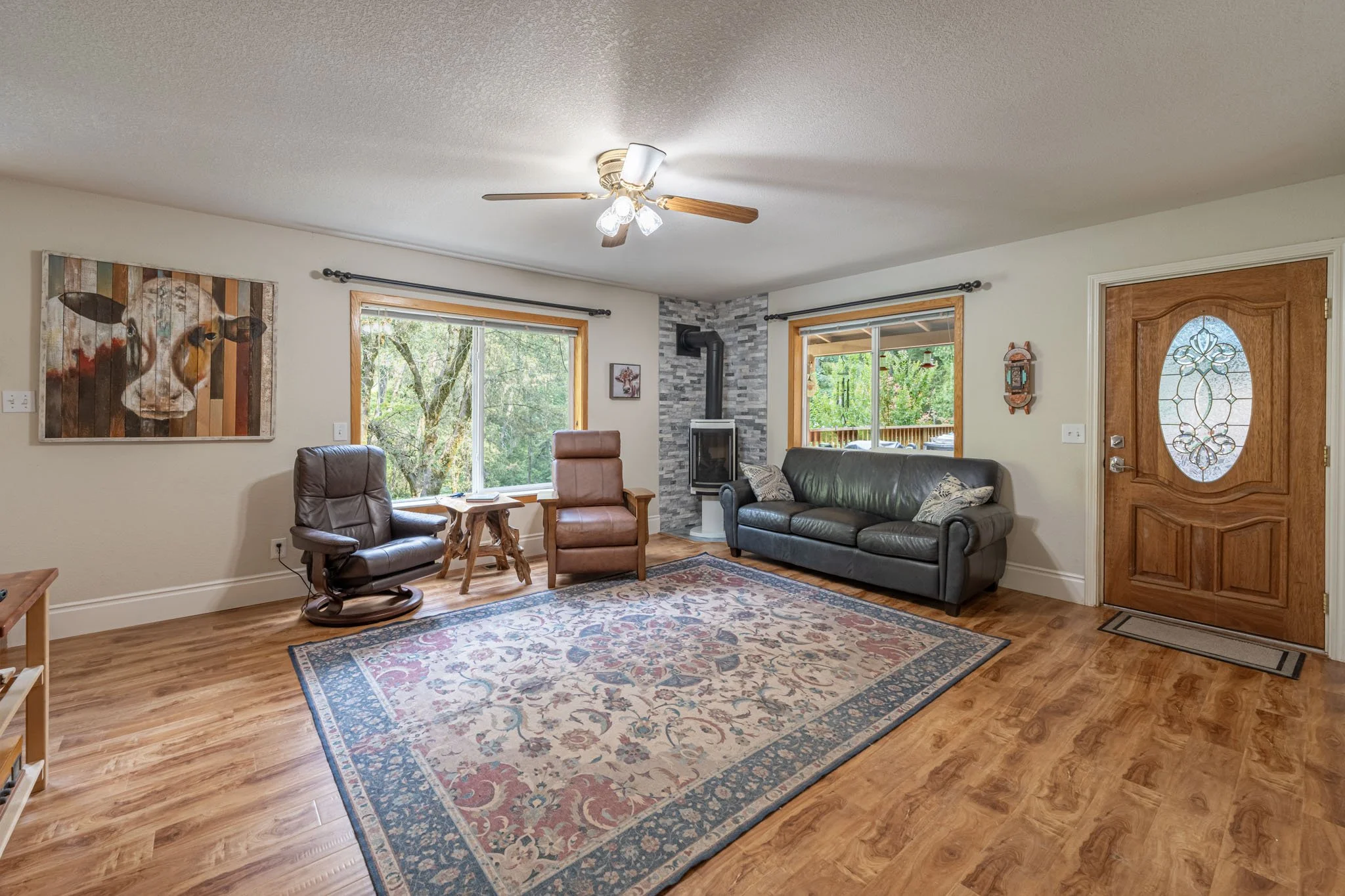 This bright, joyful custom home is truly one-of-a-kind. The large windows in every room bring in so much light, creating picture postcards of lush forest and the serene sounds of Woodpecker Creek that runs all year round.
